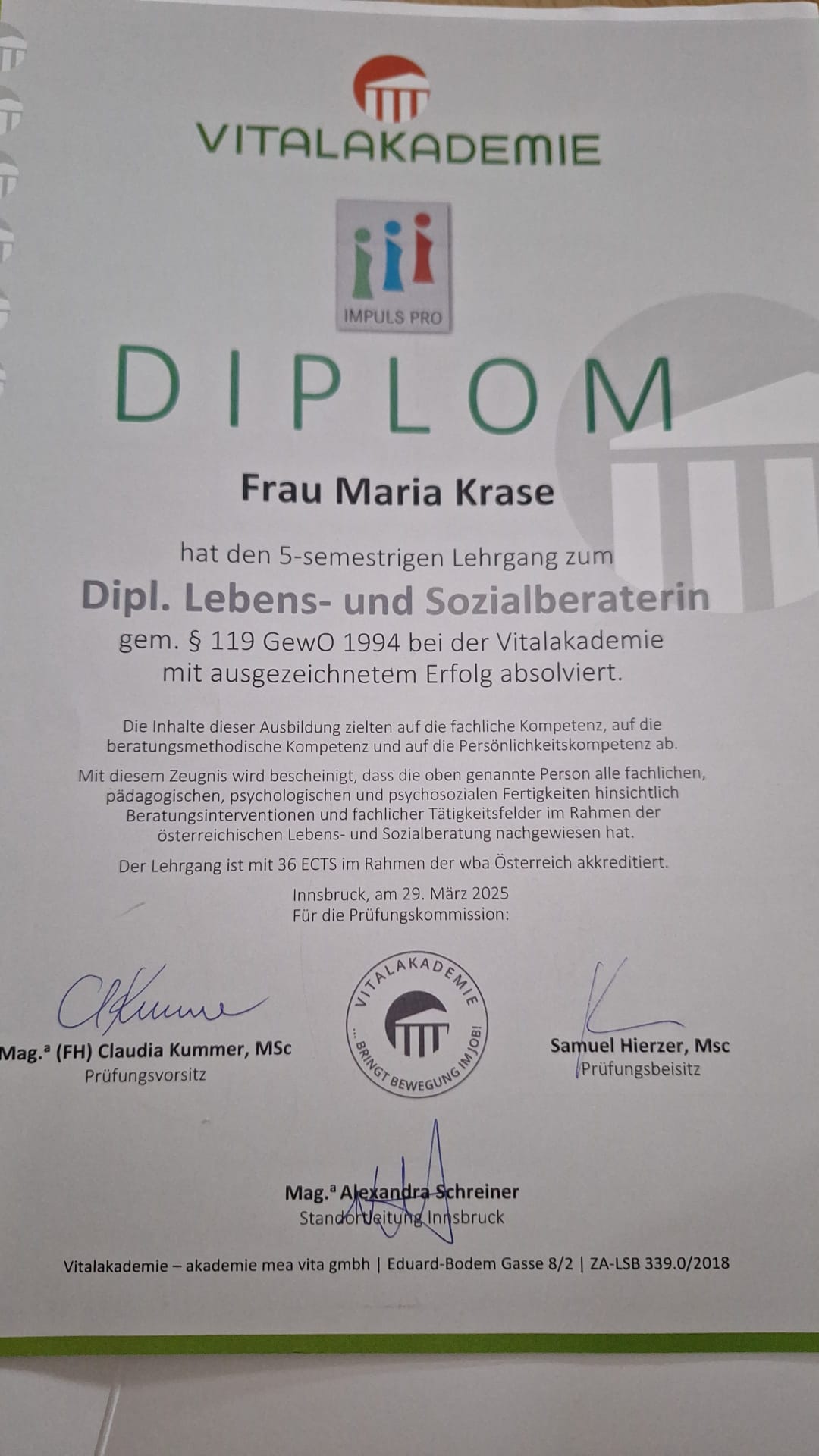 Ich bin Maria Krase, Elementarpädagogin, Mutter von zwei Kindern und Lebens- und Sozialberaterin mit Abschluss 2025. Nach vielen Jahren in Kindergärten, darunter im Integrations- und Waldbereich, liegt mein Schwerpunkt heute auf der liebevollen Begleitung von Kindern und Jugendlichen in Krisenzeiten wie Trennung oder Verlust. Mit Herz, Erfahrung und Einfühlungsvermögen unterstütze ich Familien in herausfordernden Lebensphasen.